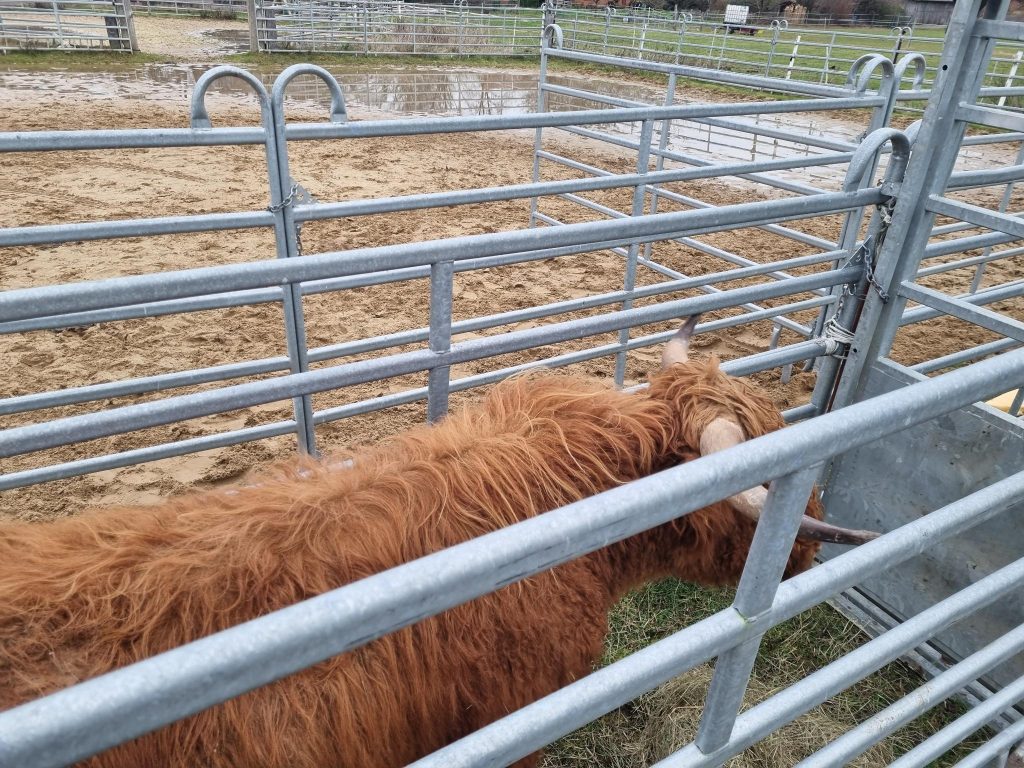 Der junge Bulle wurde im ruhigen Vorgehen zunächst am Rand des Rundgangs abgestellt, damit die ganze Herde ihn beobachten konnte, ohne sich eingeengt zu fühlen. Wir haben ihn langsam an den Treibegang herangeführt, Schritt für Schritt und ohne Druck.