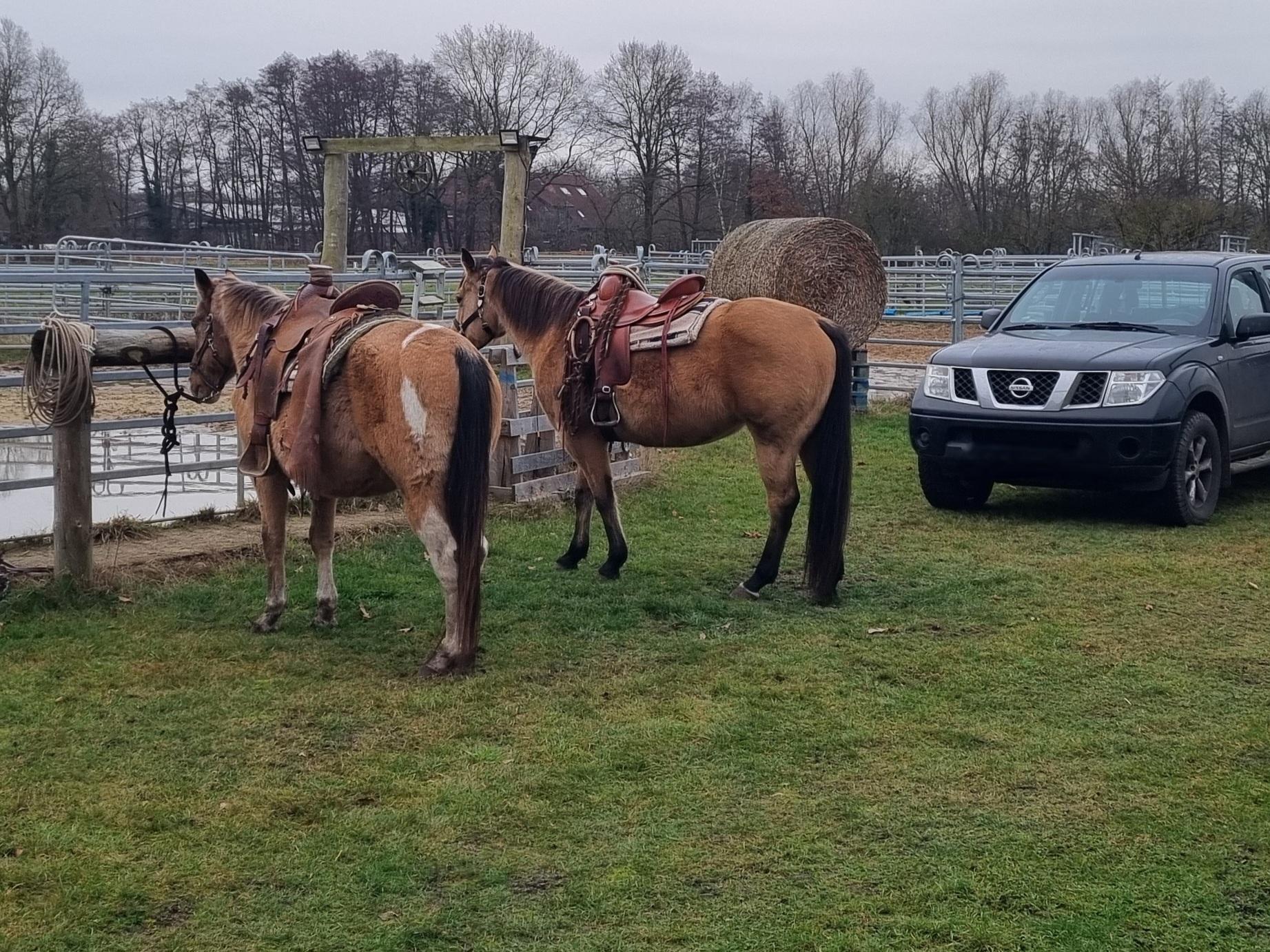 Die Pferde der Ranch, gesattelt und wartend für einen möglichen Einsatz …. lange am Anbinder stehend, ready to work, wenn es drauf ankommt => das macht unter anderem die Arbeit als Ranchpferd aus 😊.